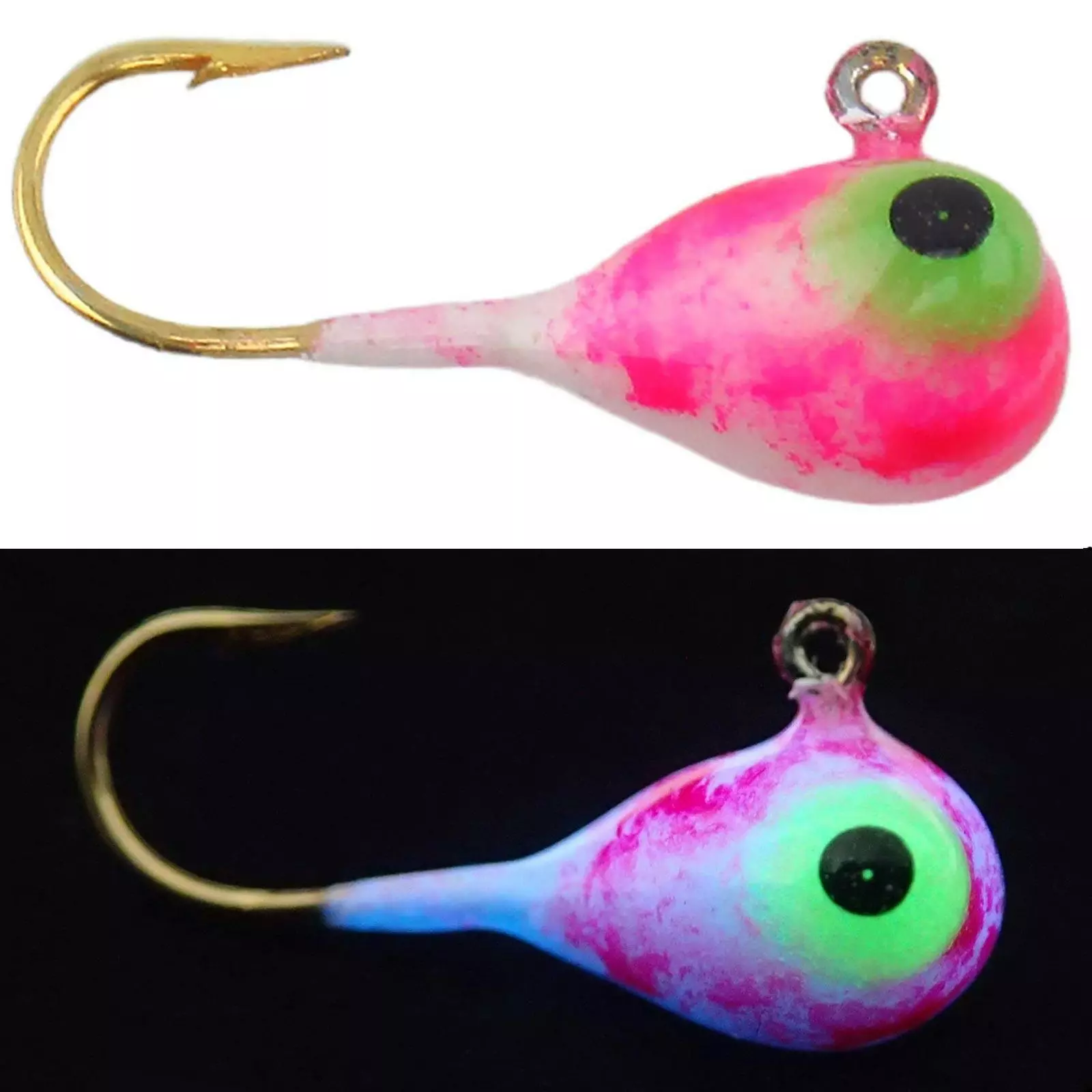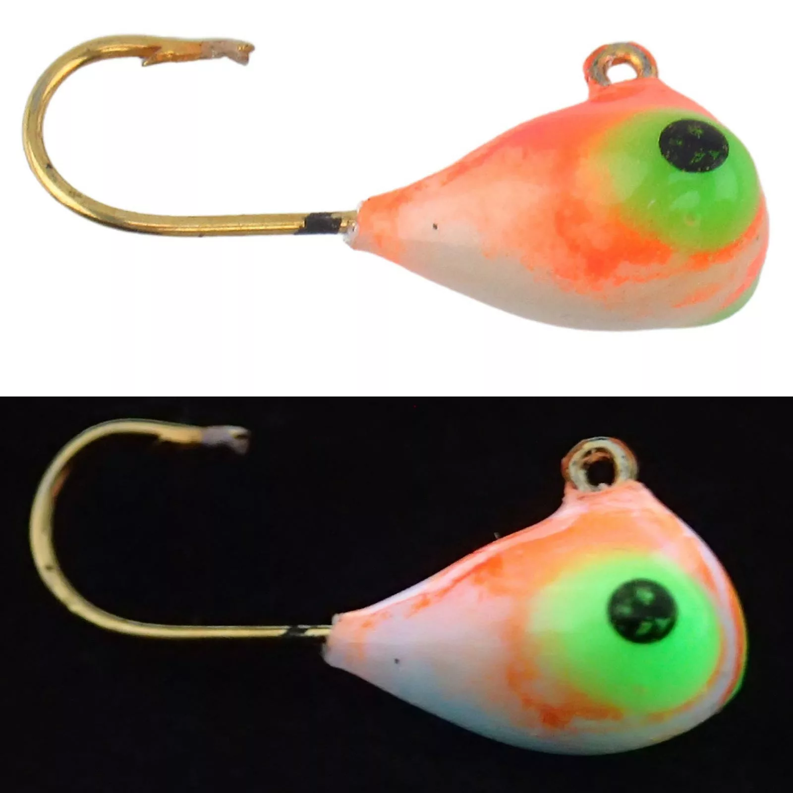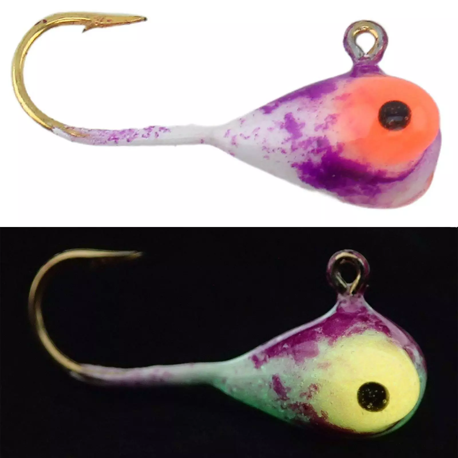 ADK Custom Jigs Hippy Tungsten Jigs are hand-painted in groovy glow colors to attract and then catch fish under the ice. Primary targets are perch, crappie, and bluegill, although the occasional bass will find itself mesmerized by the tie-dye effect of the paint job. The hippy wide width of the heavy tungsten plummets the ADK Custom Jigs far-out lures quickly and directly to the fish in your target zone. Hippie phrases aside, these are top-quality glow jigs that may outperform anything in your bag. Stand-out craftsmanship, color patterns, and super durable. Can you dig it? Let your tip-up freak flag fly with ADK Custom Jigs Hippy Tungsten Jigs!