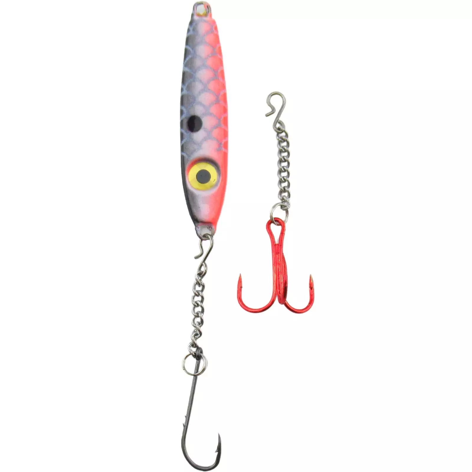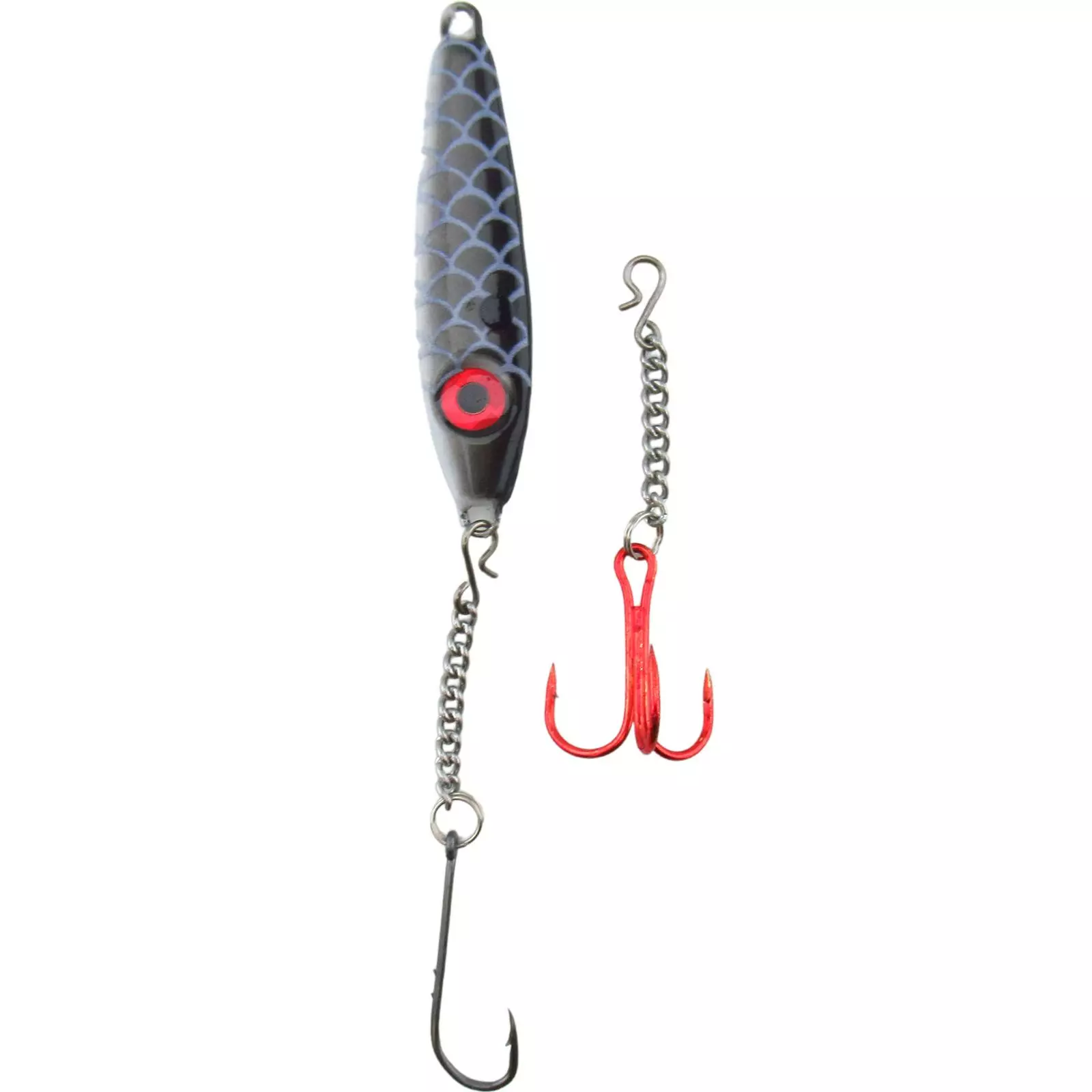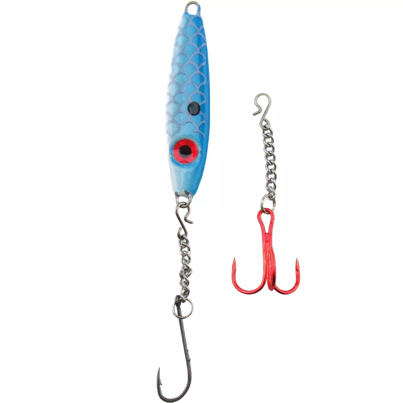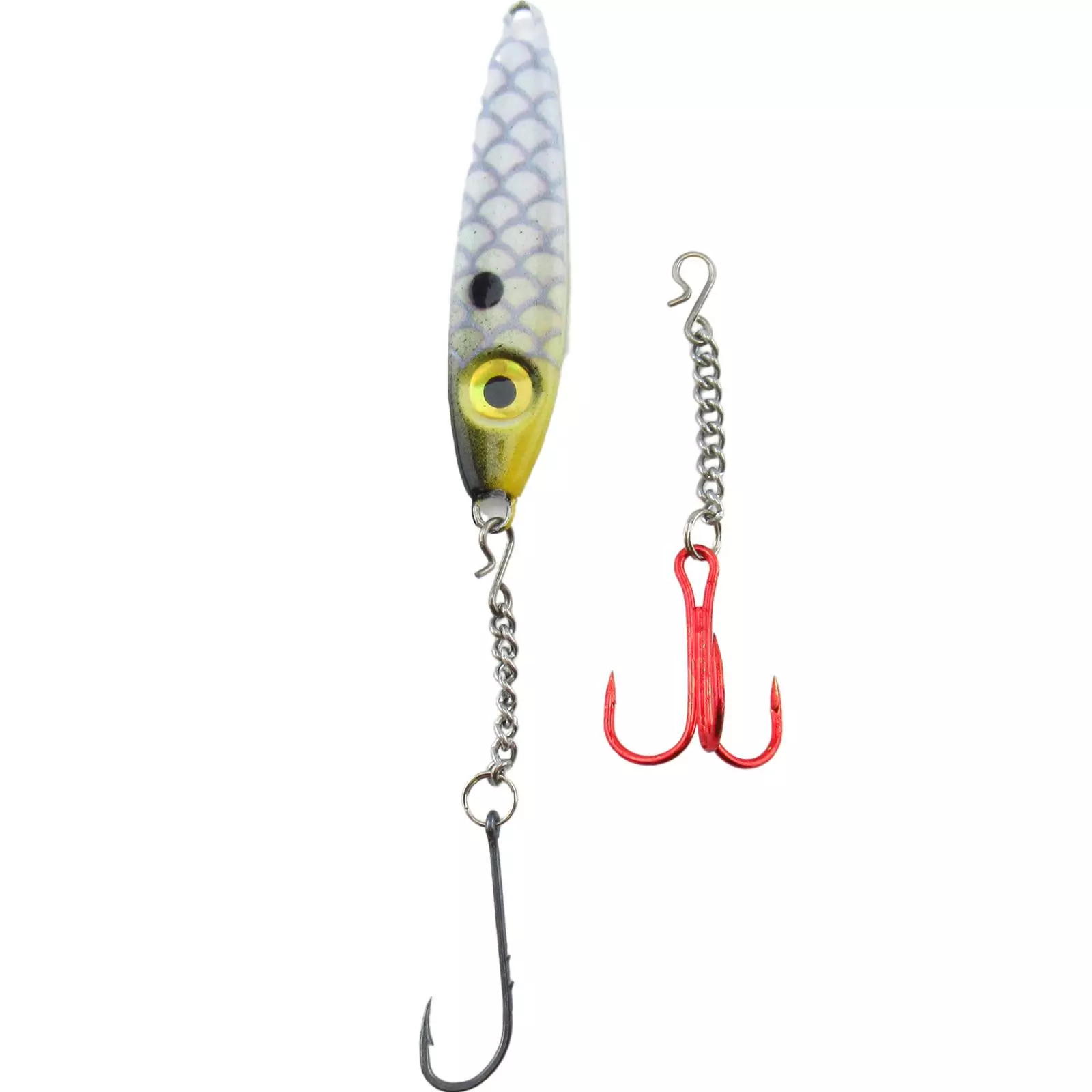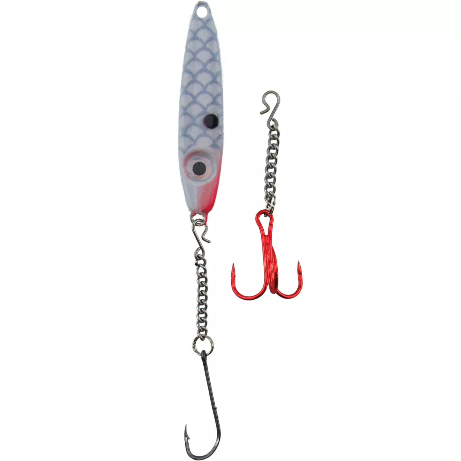 The Bink’s Ice Spoon with Chain Dropper Hooks is the same 1/8 and 1/4 oz spoon bodies as the effective vertical jigging lure the company is known for. The Bink’s Spoon is famous throughout the Midwest for its effectiveness on walleye, striper, and other fish. The Ice Spoon closely resembles juvenile shad. Drop the lure into the water, and predators view its sinking, side-to-side fluttering action as an injured shad.