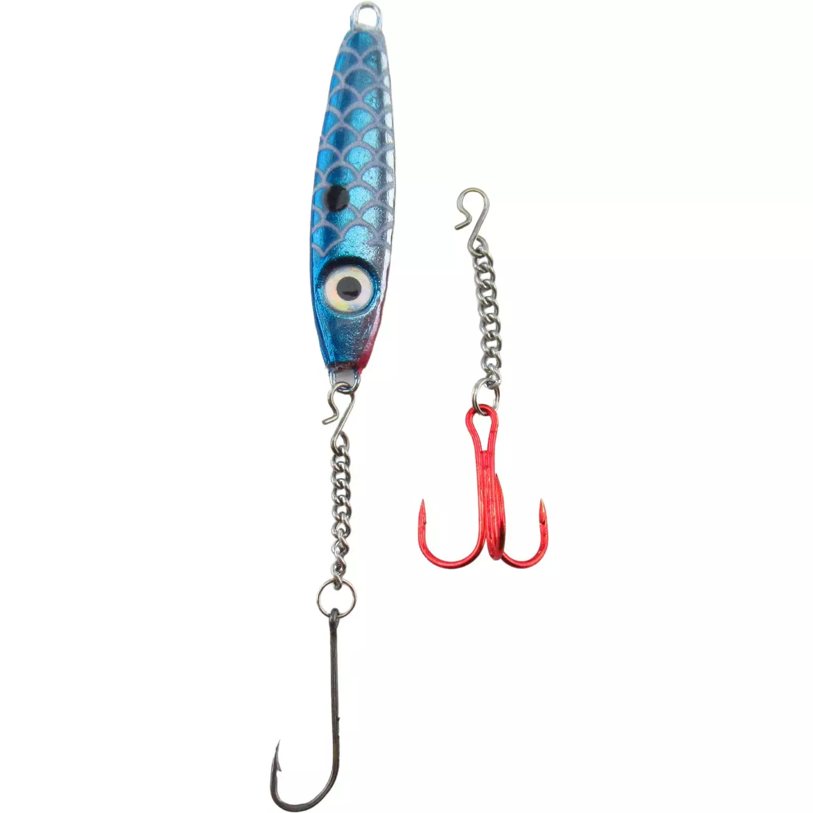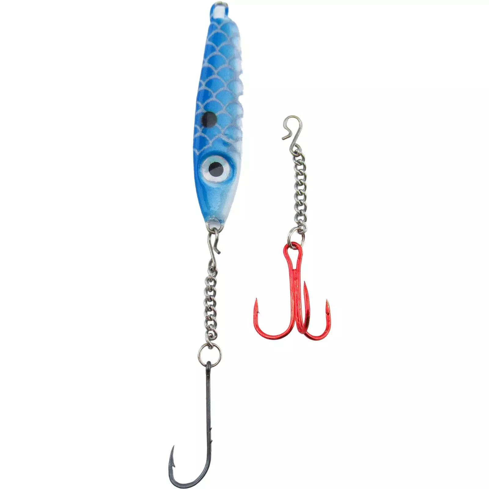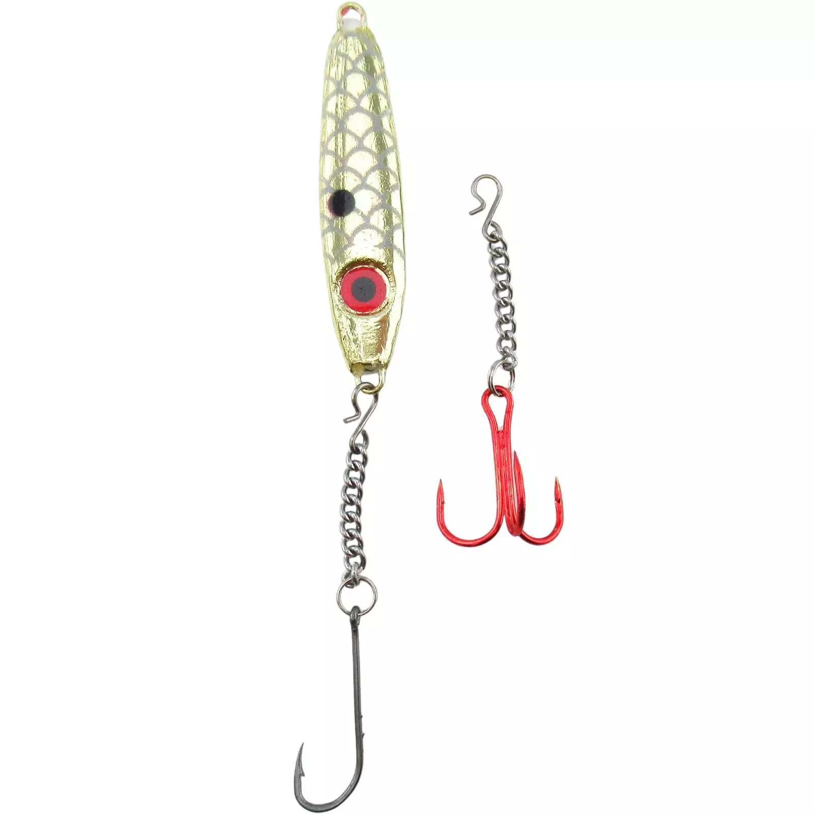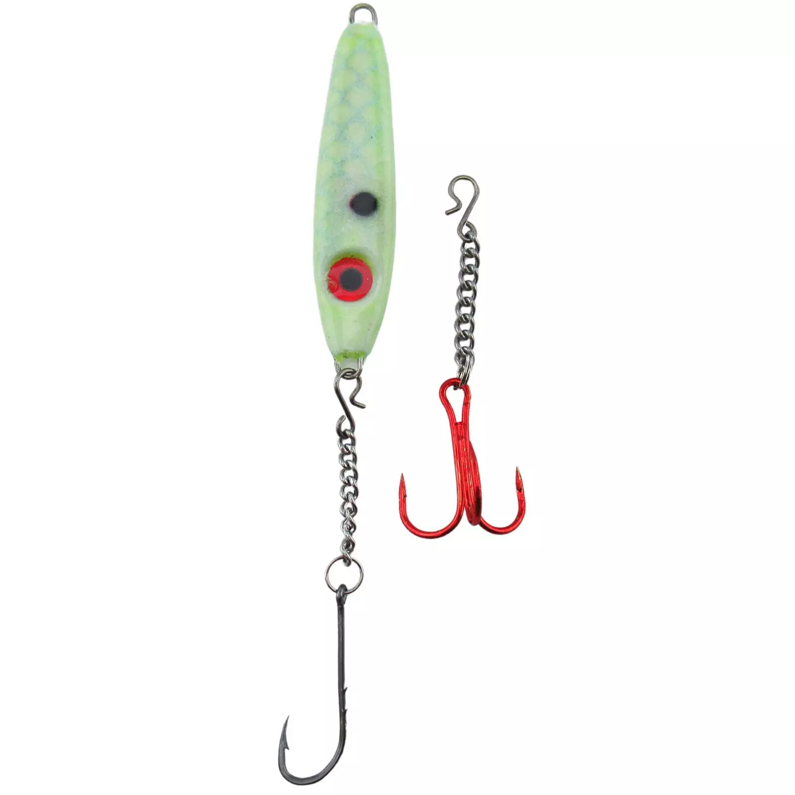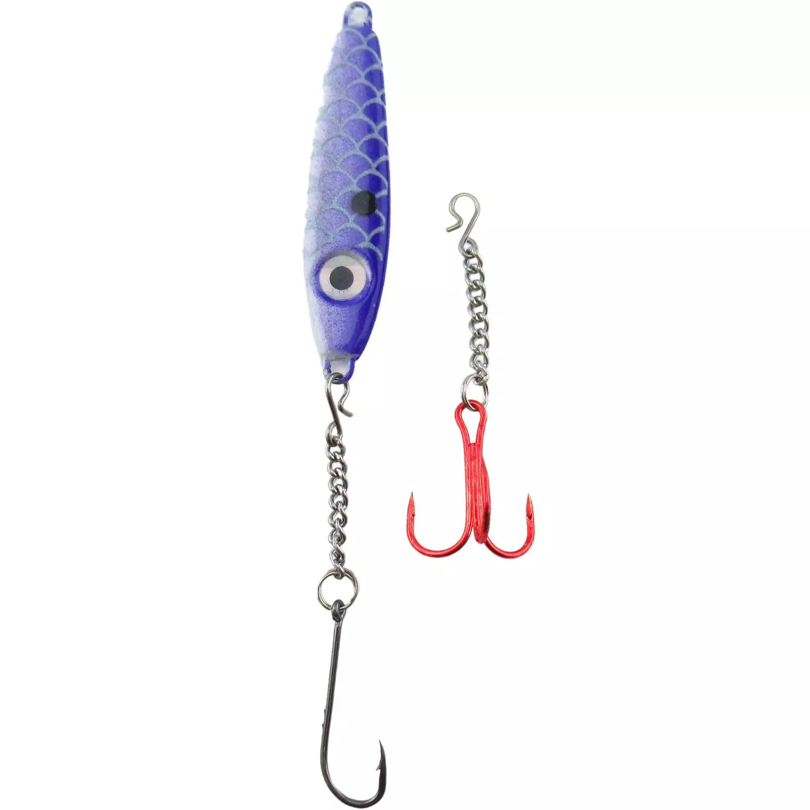 The Bink’s Ice Spoon with Chain Dropper Hooks is the same 1/8 and 1/4 oz spoon bodies as the effective vertical jigging lure the company is known for. The Bink’s Spoon is famous throughout the Midwest for its effectiveness on walleye, striper, and other fish. The Ice Spoon closely resembles juvenile shad. Drop the lure into the water, and predators view its sinking, side-to-side fluttering action as an injured shad.