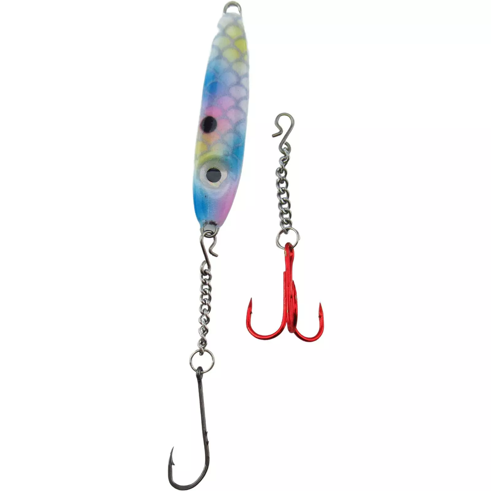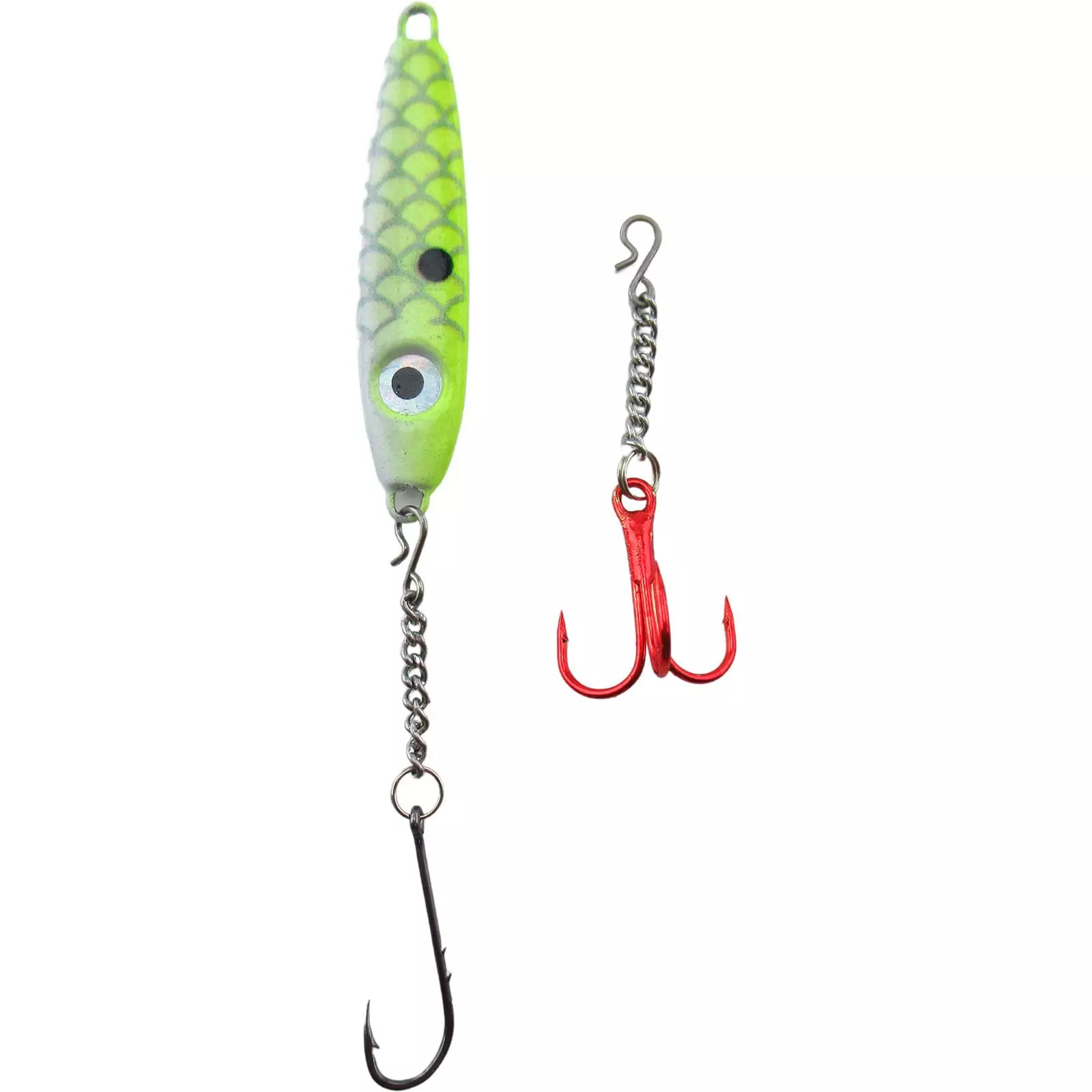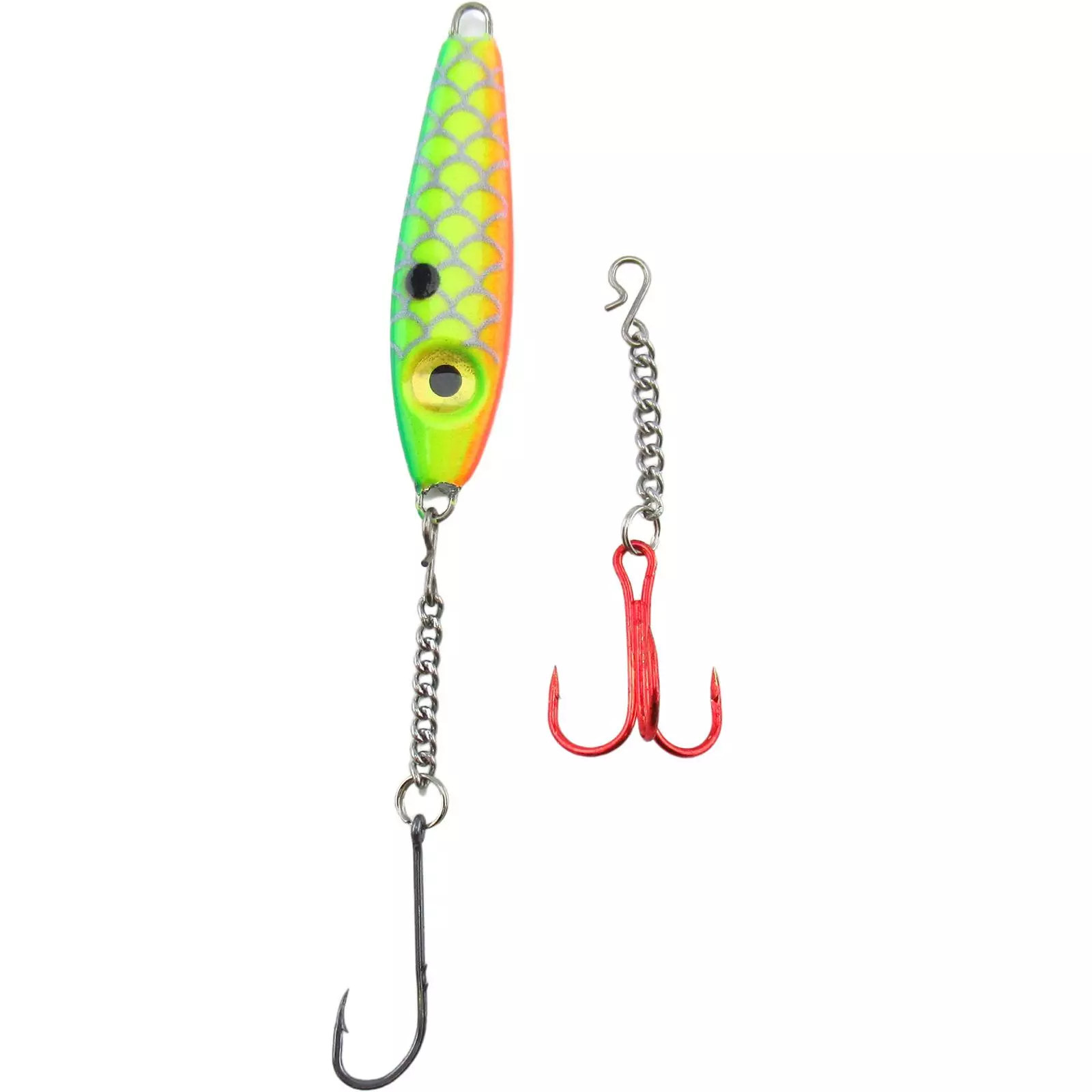 Ice Spoons come with an attached single bait holder chain dropper hook, which is stainless steel and 1/2 inch long. The package also includes a spare red treble chain dropper hook. There’s a wide color selection here – as long as there is ice on the water, you would do well to put these deadly Bink’s Ice Spoon with Chain Dropper Hooks in your ice fishing arsenal!