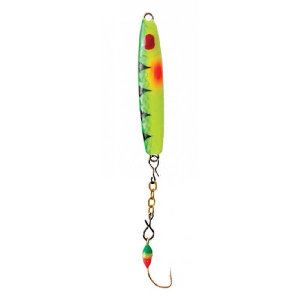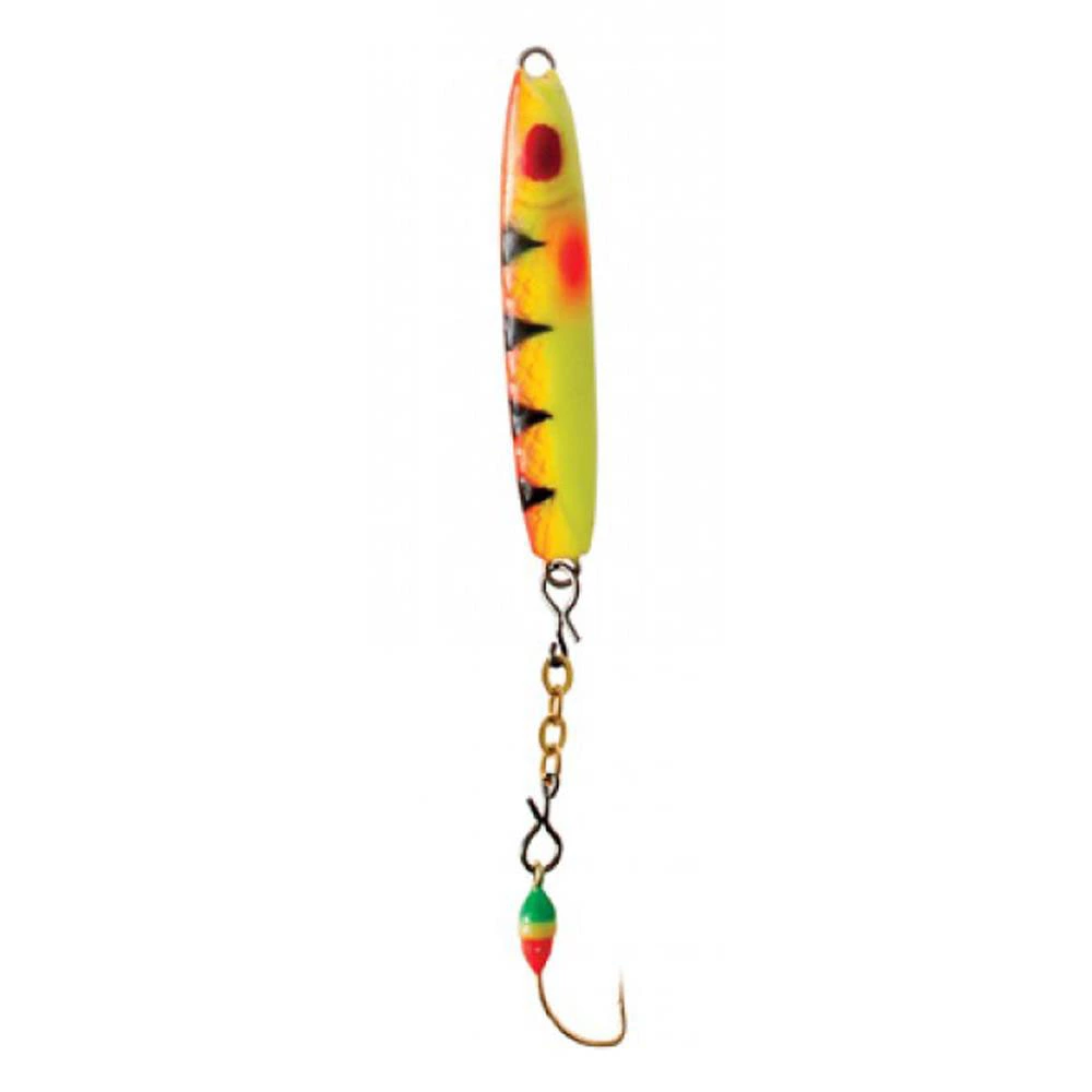 Clam Speed Spoons have a body that resembles a minnow and a dropper chain that gets the fish on. These are ideal for heavily pressured fish and has a custom firetiger bar pattern. Clam Speed Spoons are good if you’re after walleye, perch, and crappie. They can be baited with a minnow head, euro larvae, waxi, spike, and more. Clam Speed Spoons are made of lead.