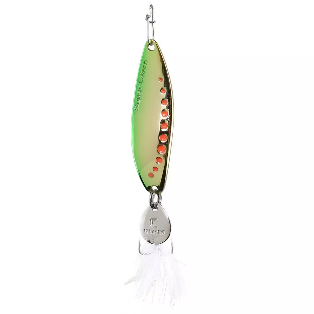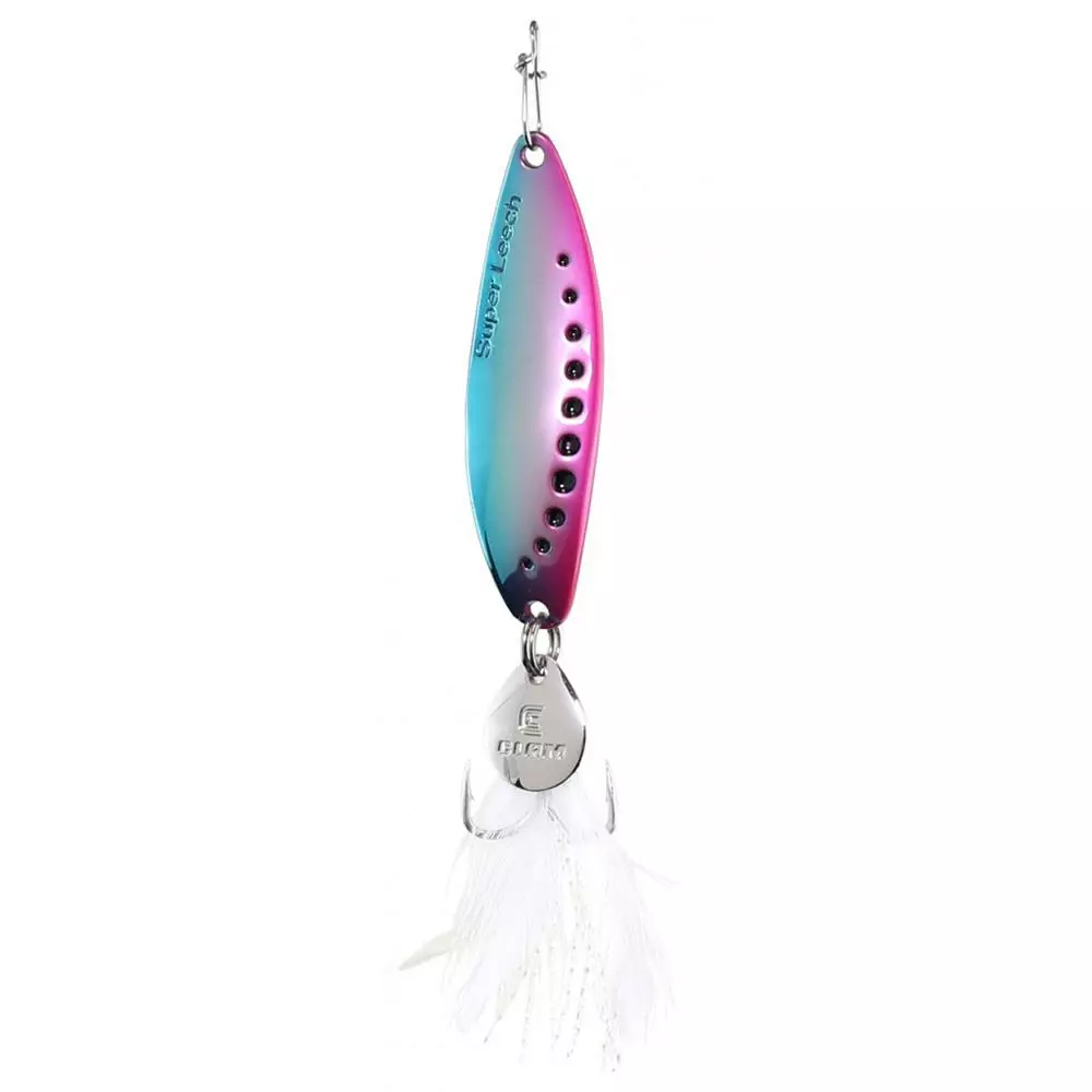 The Clam Super Leech Flutter Spoon is a larger spoon with feathering that sinks with a distinct back and forth tumble motion that produces loads of flash. This lure is made with super lightweight zinc, a feathered bottom, and a flashy flapper for a noisy fluttering and tumble on its way down. The Super Leech Flutter Spoon is painted with the brightest metallic finished available to ensure maximum flash under the water.