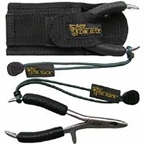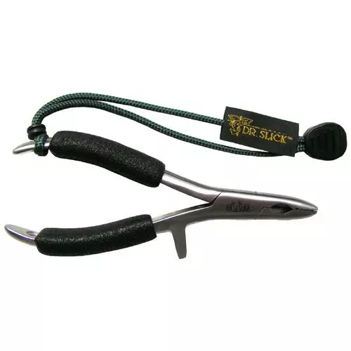Dr. Slick Bullet Head Pliers feature 410 stainless steel construction. The short paddle shaped aggressive jaw structure ensures a secure grip when removing hooks. The side cutters feature a Rockwell hardness of 45. The foam grips help to prevent slippage while adding comfort. The included lanyard and holster provide loss protection and secure storage to keep them close at hand.