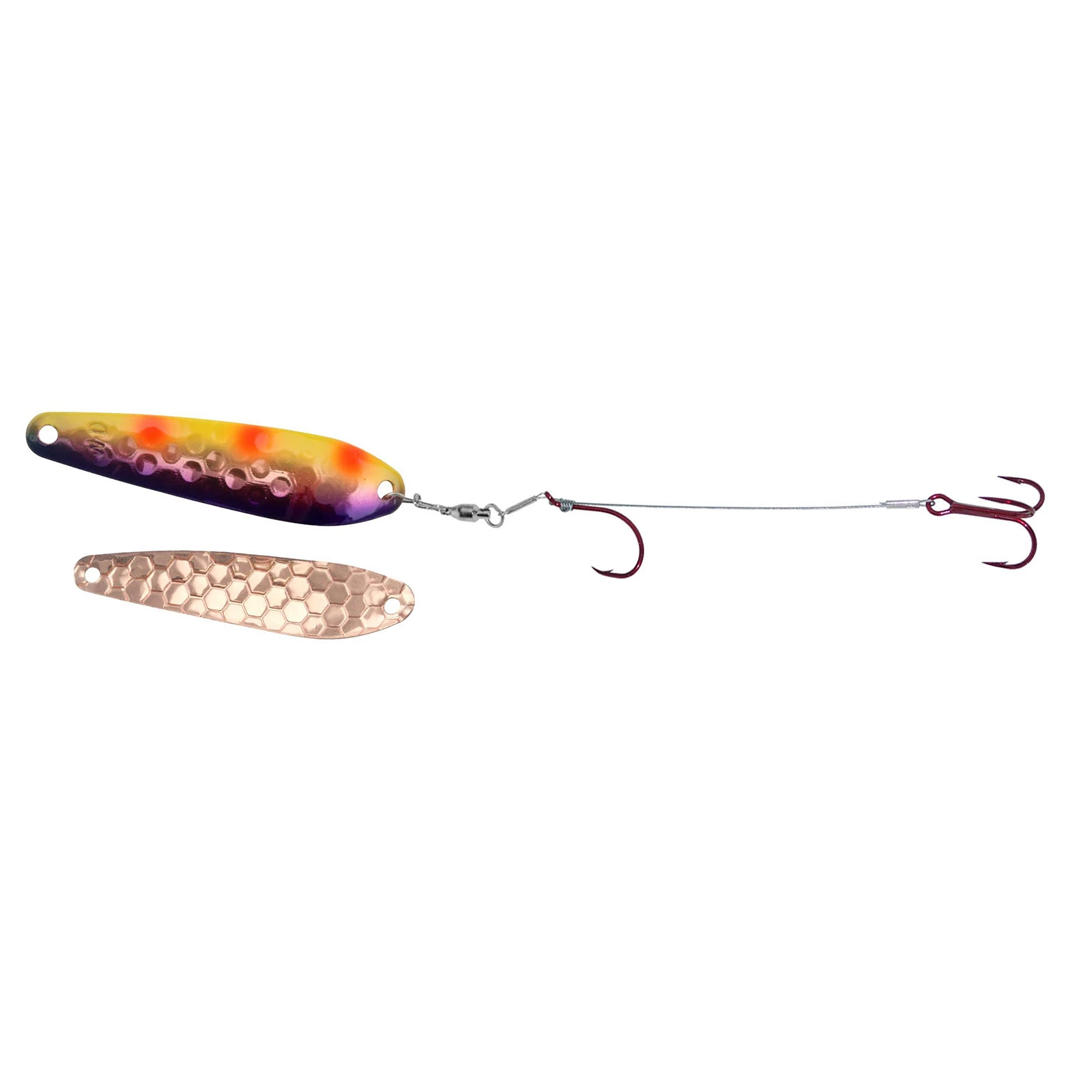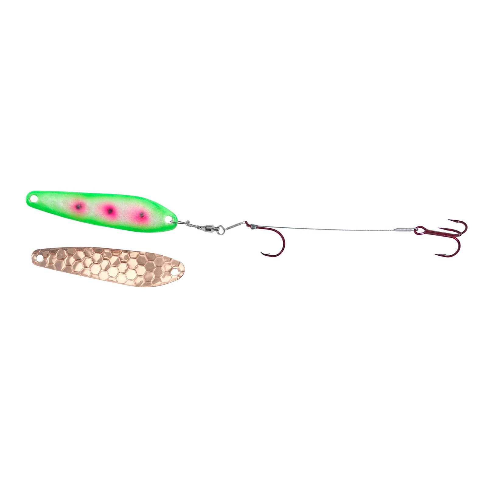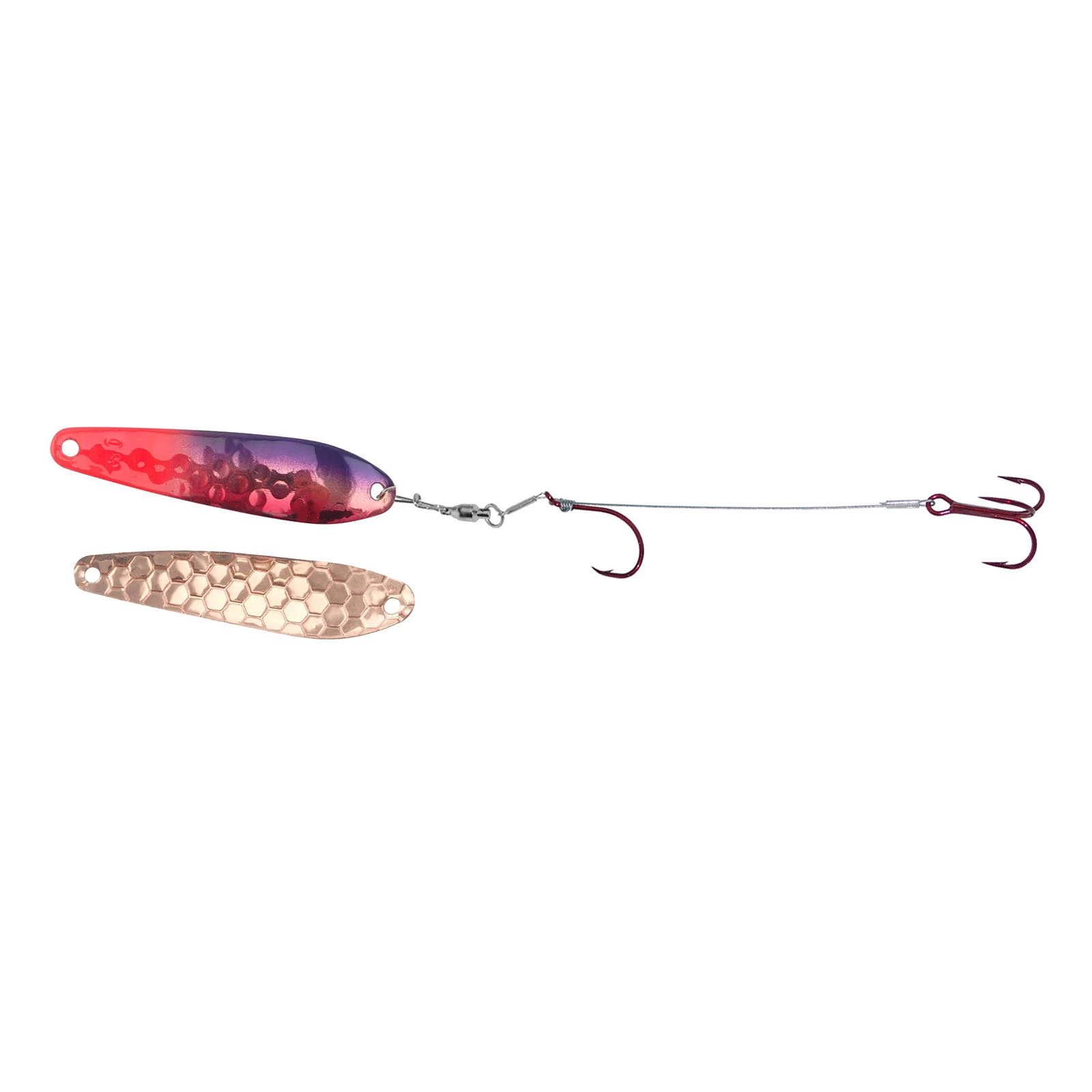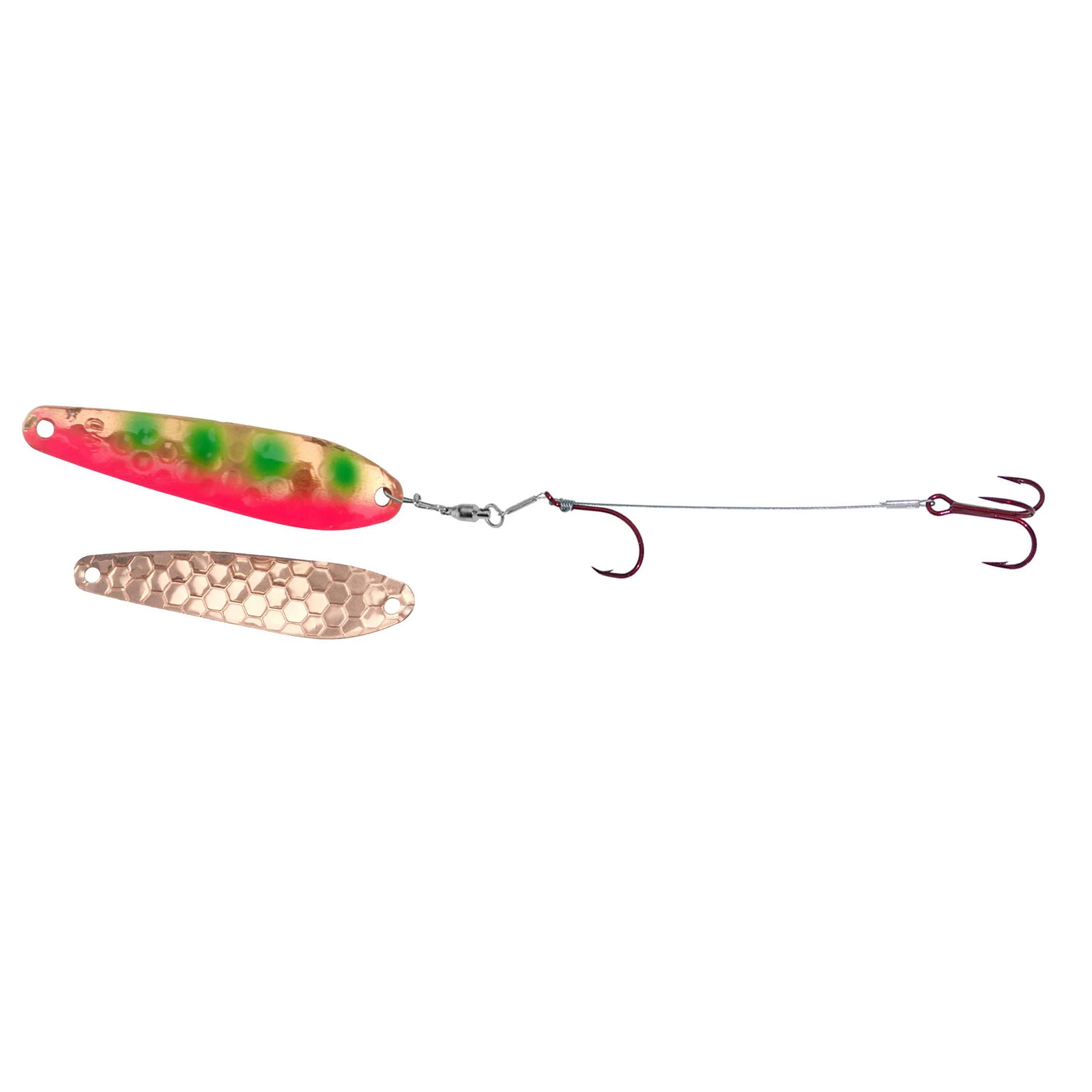 Dreamweaver Wormburners combine a Dreamweaver WD Series trolling spoon with standard wire crawler harness giving the angler a whole new bait design that fish have never seen before. Unlike other crawler harnesses that have to be trolled at very slow speeds, the Wormburner allows you to troll up to 4 mph! Because of this, the Wormburner can be trolled with crank and stick baits and spoons, baits that traditionally are trolled at faster speeds. Wormburner live bait harnesses features a ball bearing swivel and a single size two red octopus hook with a size four red treble hook stinger.