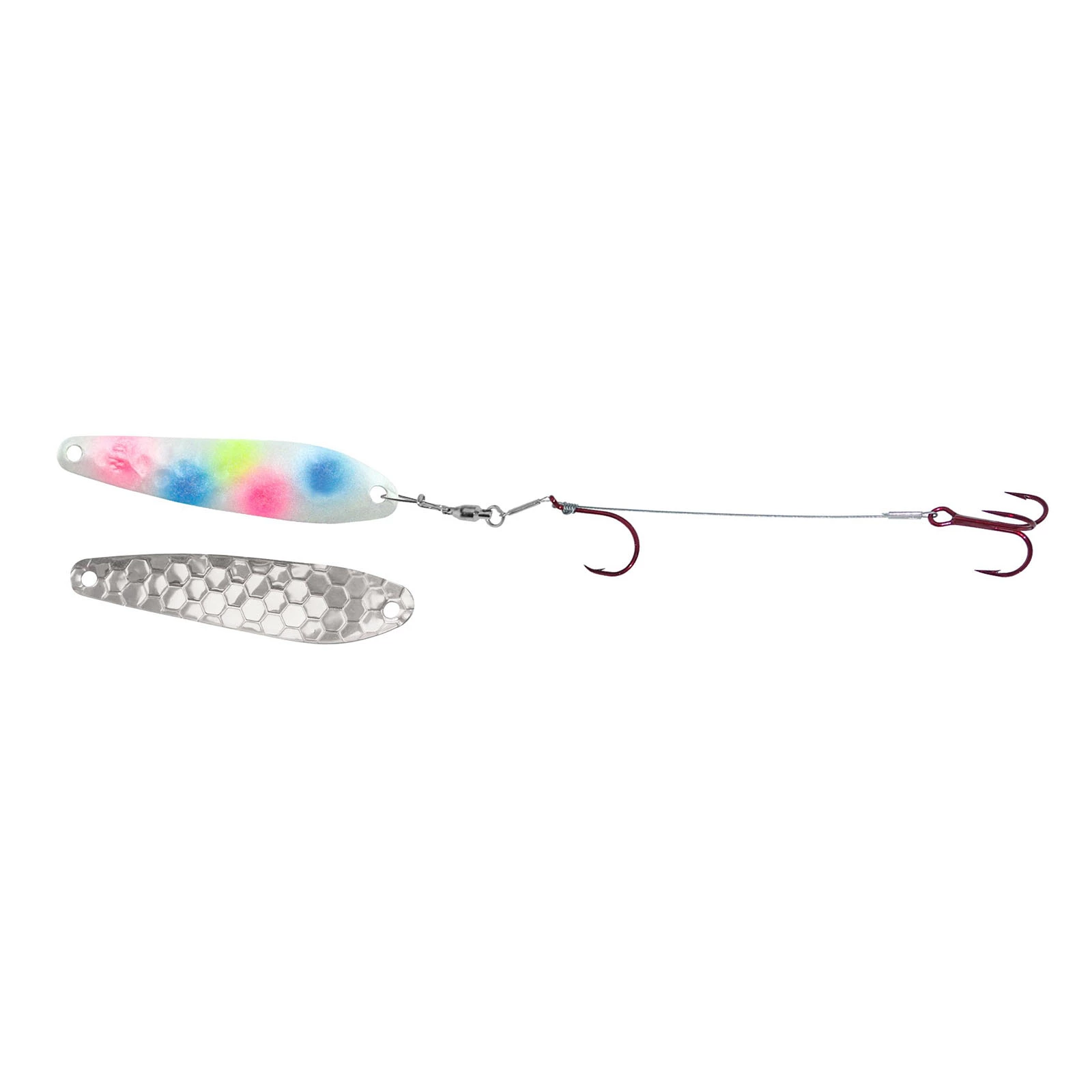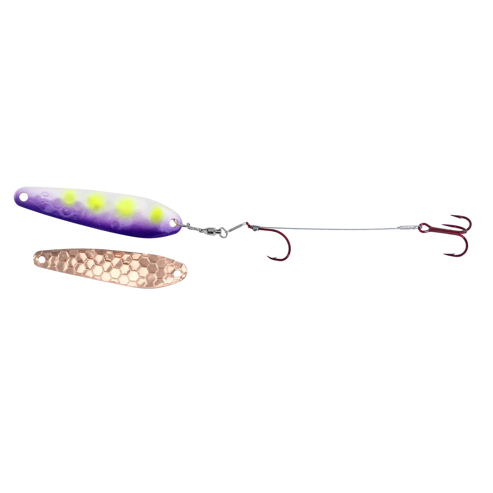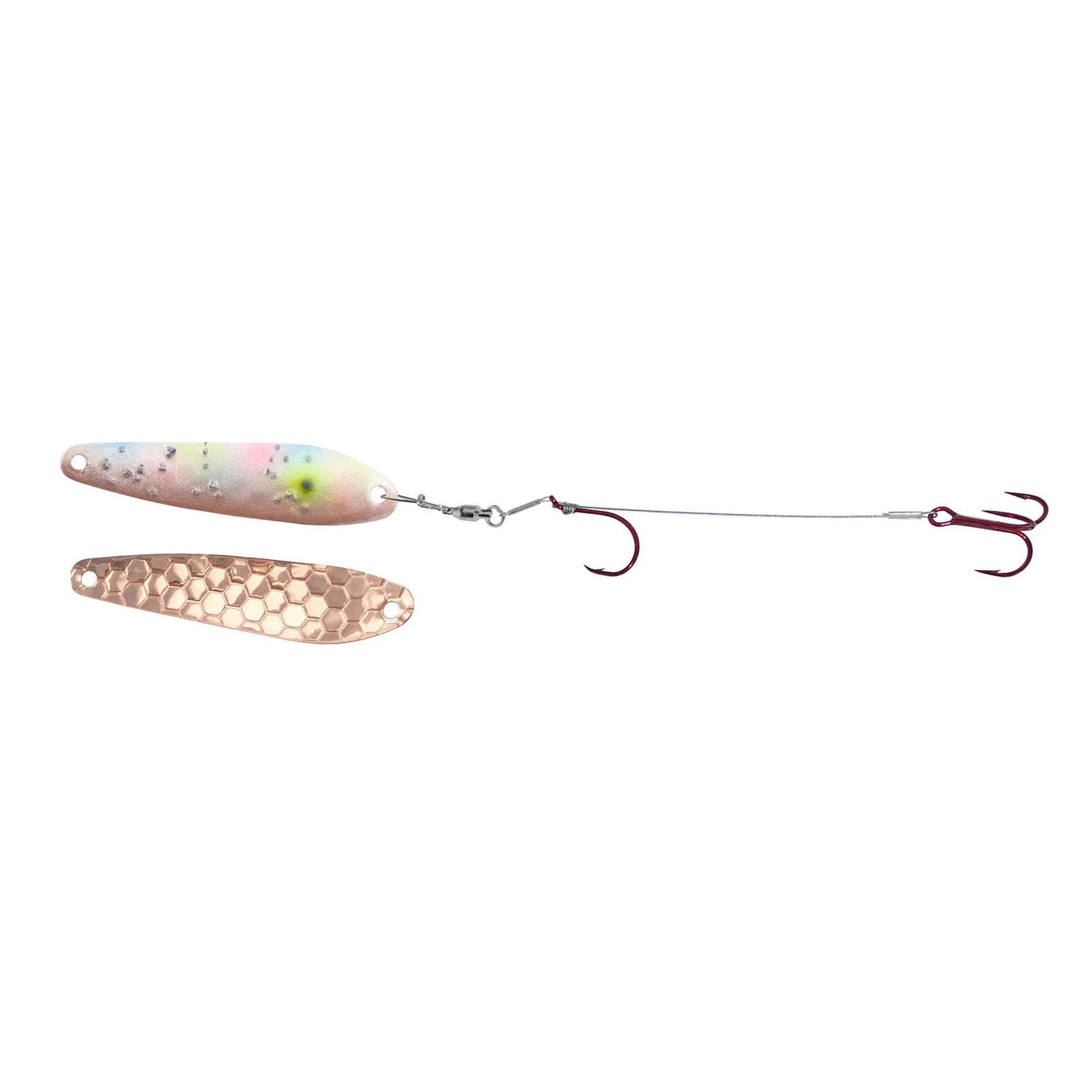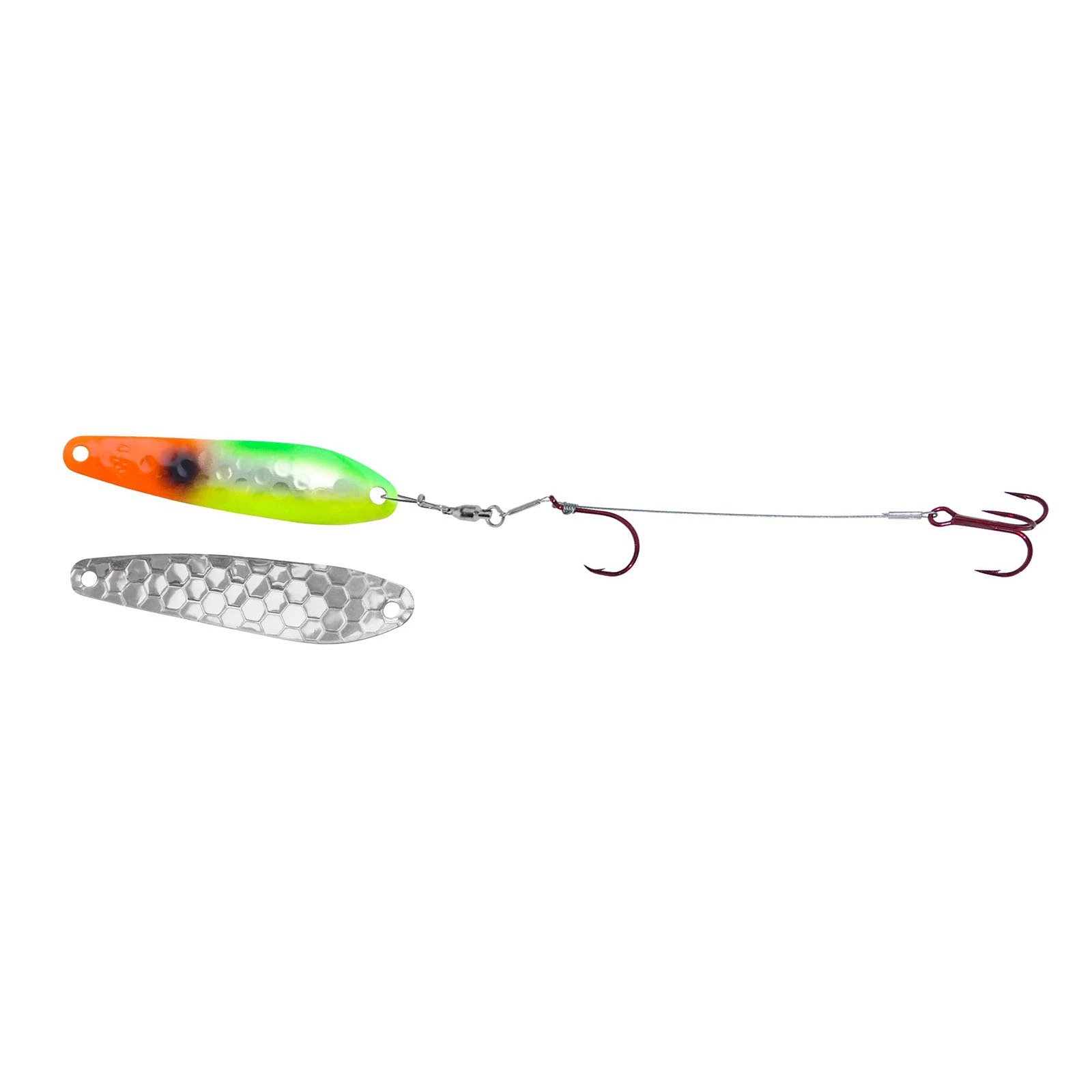 Dreamweaver Wormburners combine a Dreamweaver WD Series trolling spoon with standard wire crawler harness giving the angler a whole new bait design that fish have never seen before. Unlike other crawler harnesses that have to be trolled at very slow speeds, the Wormburner allows you to troll up to 4 mph! Because of this, the Wormburner can be trolled with crank and stick baits and spoons, baits that traditionally are trolled at faster speeds. Wormburner live bait harnesses features a ball bearing swivel and a single size two red octopus hook with a size four red treble hook stinger.