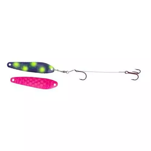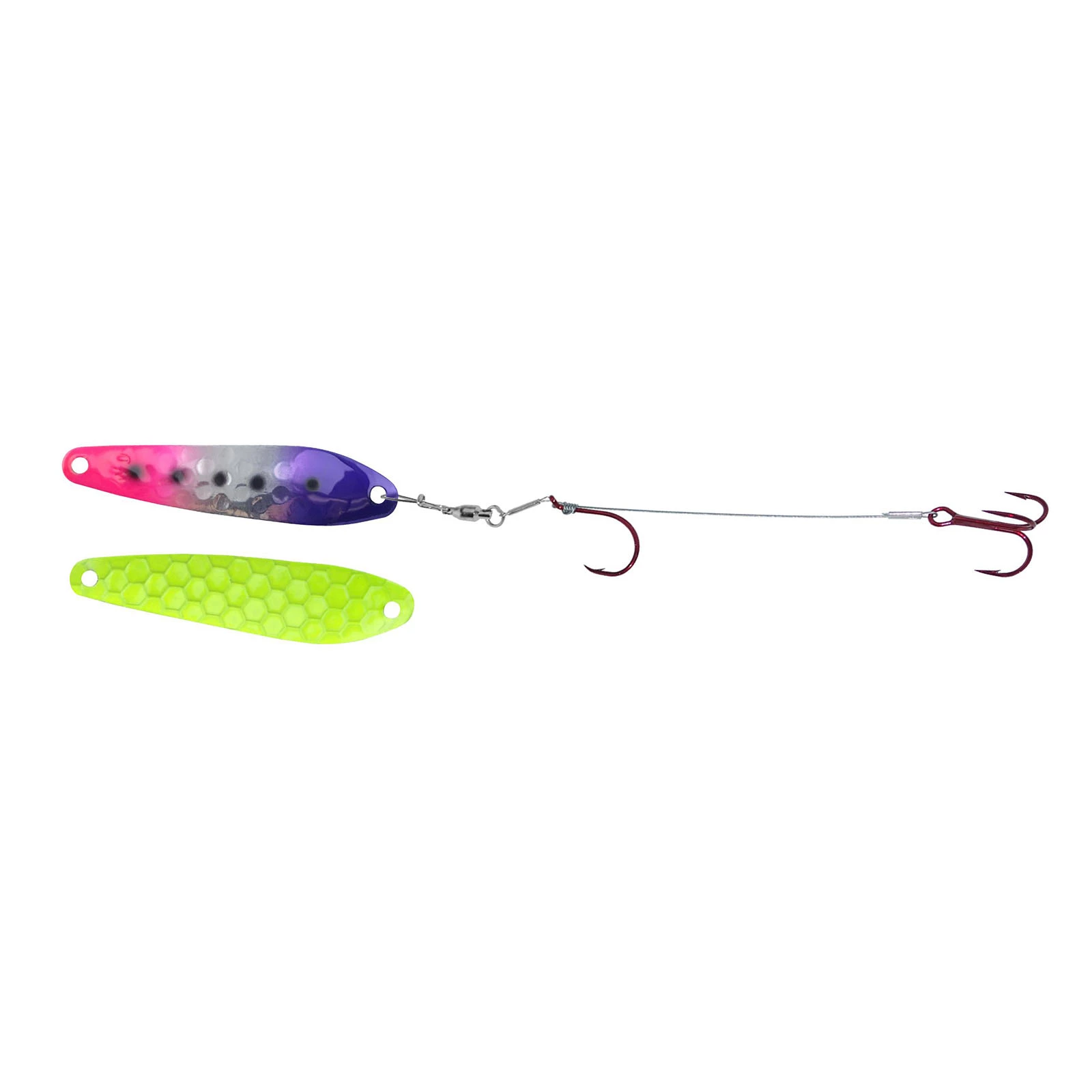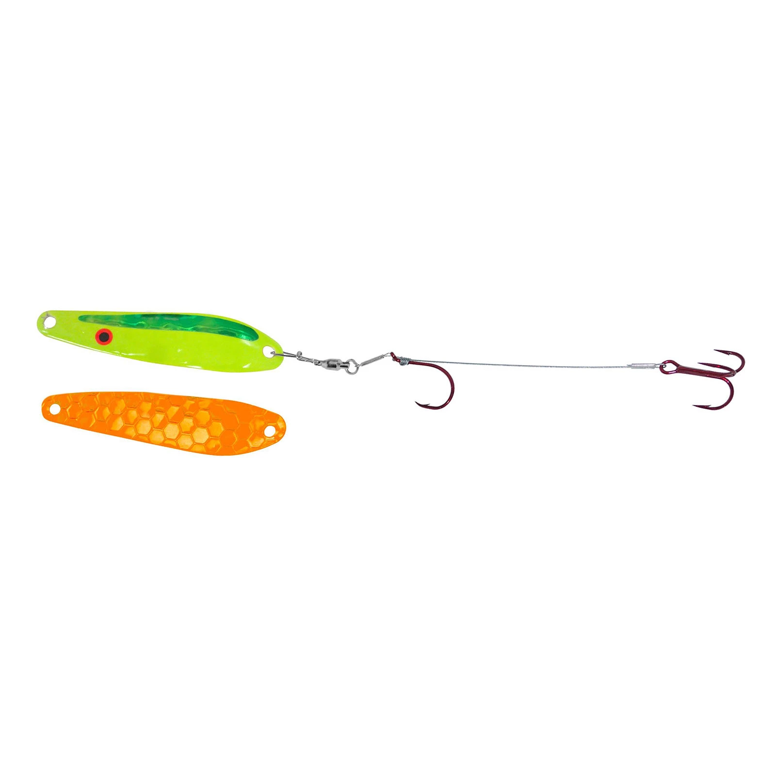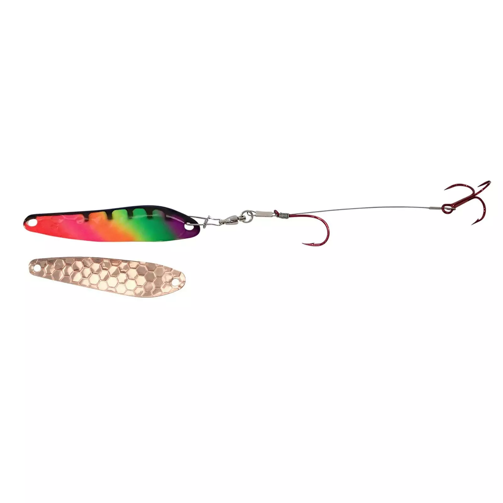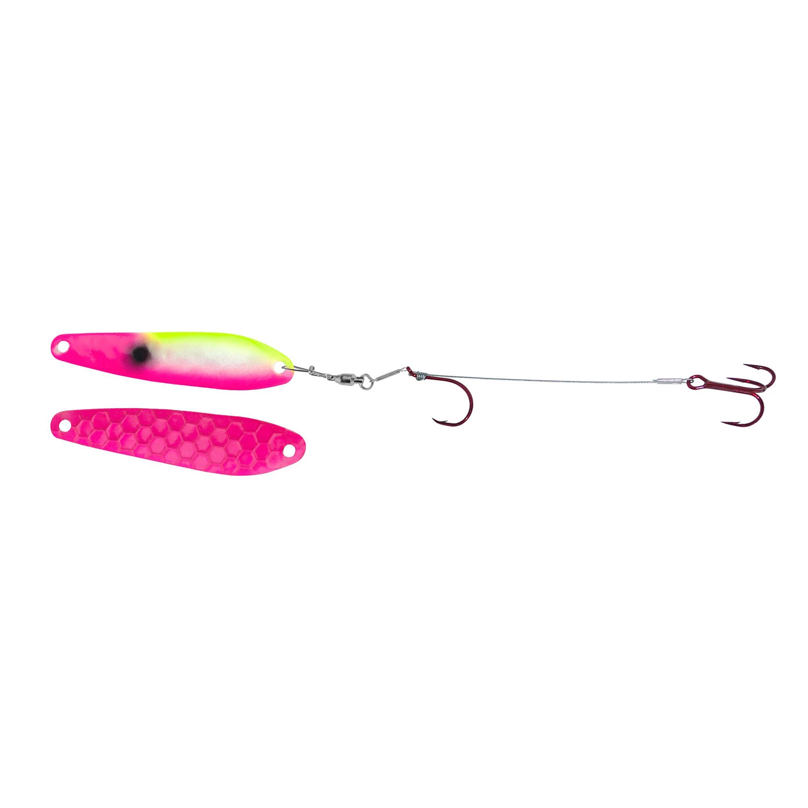 Dreamweaver Wormburners combine a Dreamweaver WD Series trolling spoon with standard wire crawler harness giving the angler a whole new bait design that fish have never seen before. Unlike other crawler harnesses that have to be trolled at very slow speeds, the Wormburner allows you to troll up to 4 mph! Because of this, the Wormburner can be trolled with crank and stick baits and spoons, baits that traditionally are trolled at faster speeds. Wormburner live bait harnesses features a ball bearing swivel and a single size two red octopus hook with a size four red treble hook stinger.