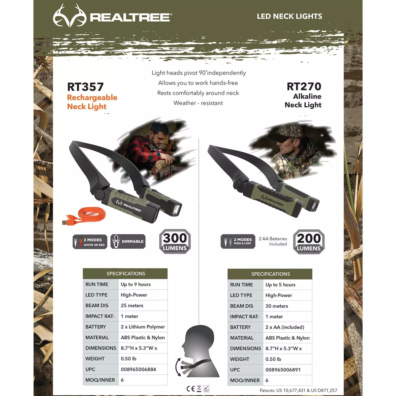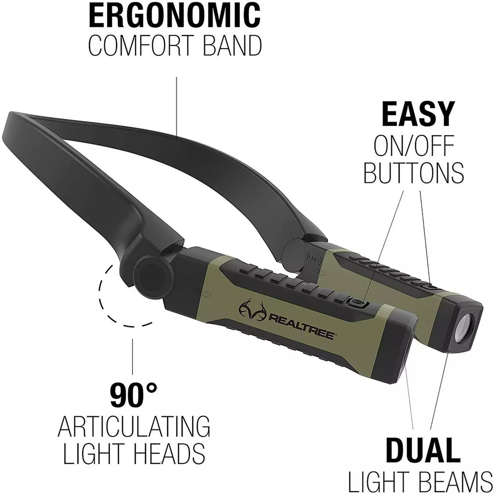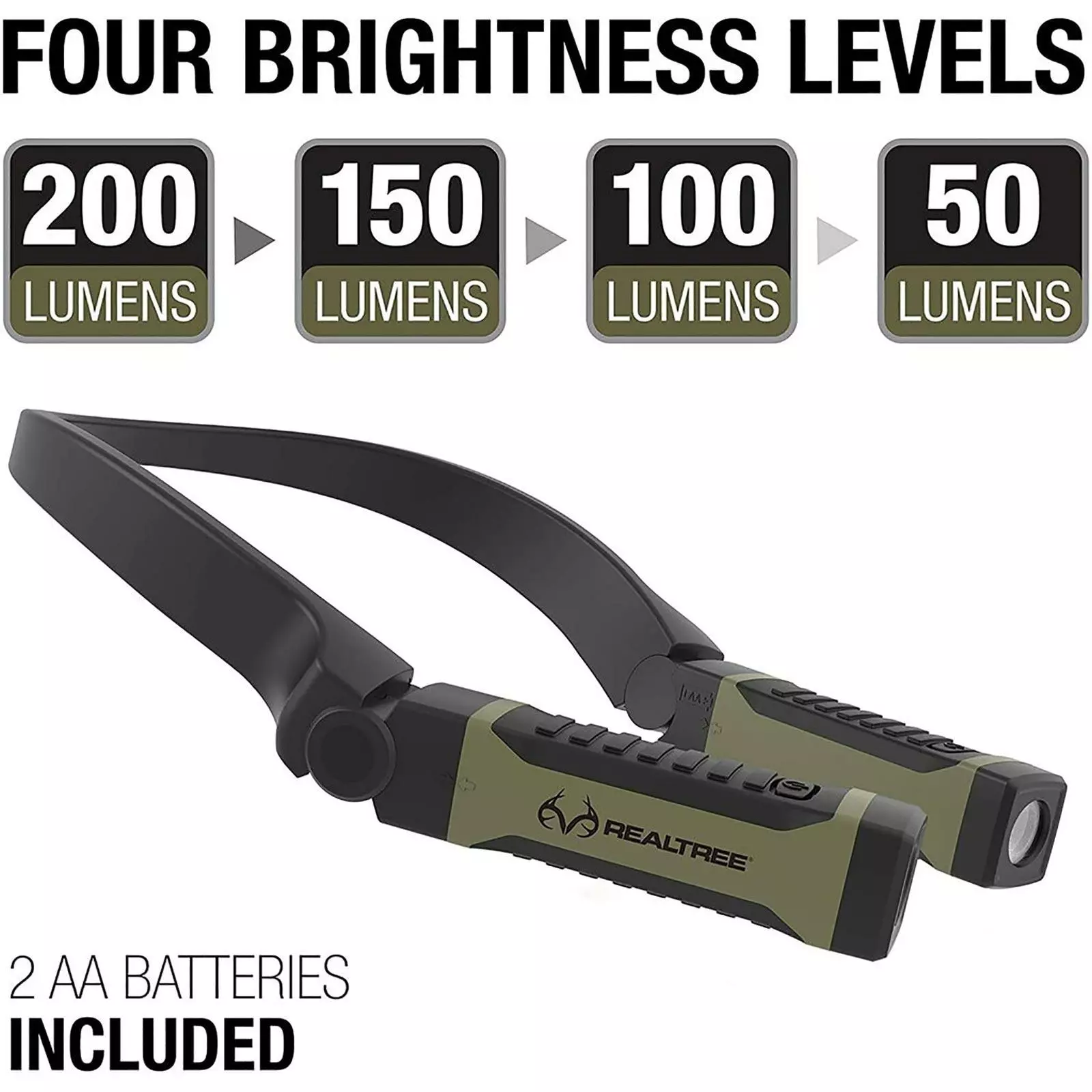 An EZRED RealTree ANYWEAR Alkaline LED Neck Light is 200 lumens of lighting power around your neck for fishing in the dark! This revolutionary design is worn comfortably around your neck for hands-free access to all of your fishing gear during low-light periods. The LED neck lamp takes two AA batteries (included) and can run up to five hours. Illuminate at close quarters for baiting or removing hooks by adjusting the 90-degree pivoting beams downward; widen the range up to 30 meters by spreading the beams in opposite vertical directions. The weather-resistant ANYWEAR LED Neck Light offers reliable light in rain or snow, too! Ditch the sweatband on that ill-fitting headlamp that messes up your hat! Get the light that rests on your neck! Early morning and late evening fishing is better with the help of the EZRED RealTree ANYWEAR Alkaline LED Neck Light!