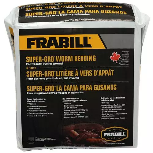 Frabill Super-Gro Worm Bedding keeps worms lively all year round. This bedding material is a great alternative to dirt, it keeps bait cleaner and free of foul odors. Frabill Super-Gro Worm Bedding is odorless and creates a perfectly ph-balanced environment for your worms. The built in food source provides the necessary nutrients needed to sustain fresher, livelier worms. Frabill Super-Gro Worm Bedding is easy to use, simply mix one pound of bedding material with 1 1/2 quarts of water, then transfer baitworms to the top of the Super-Gro Worm Bedding.