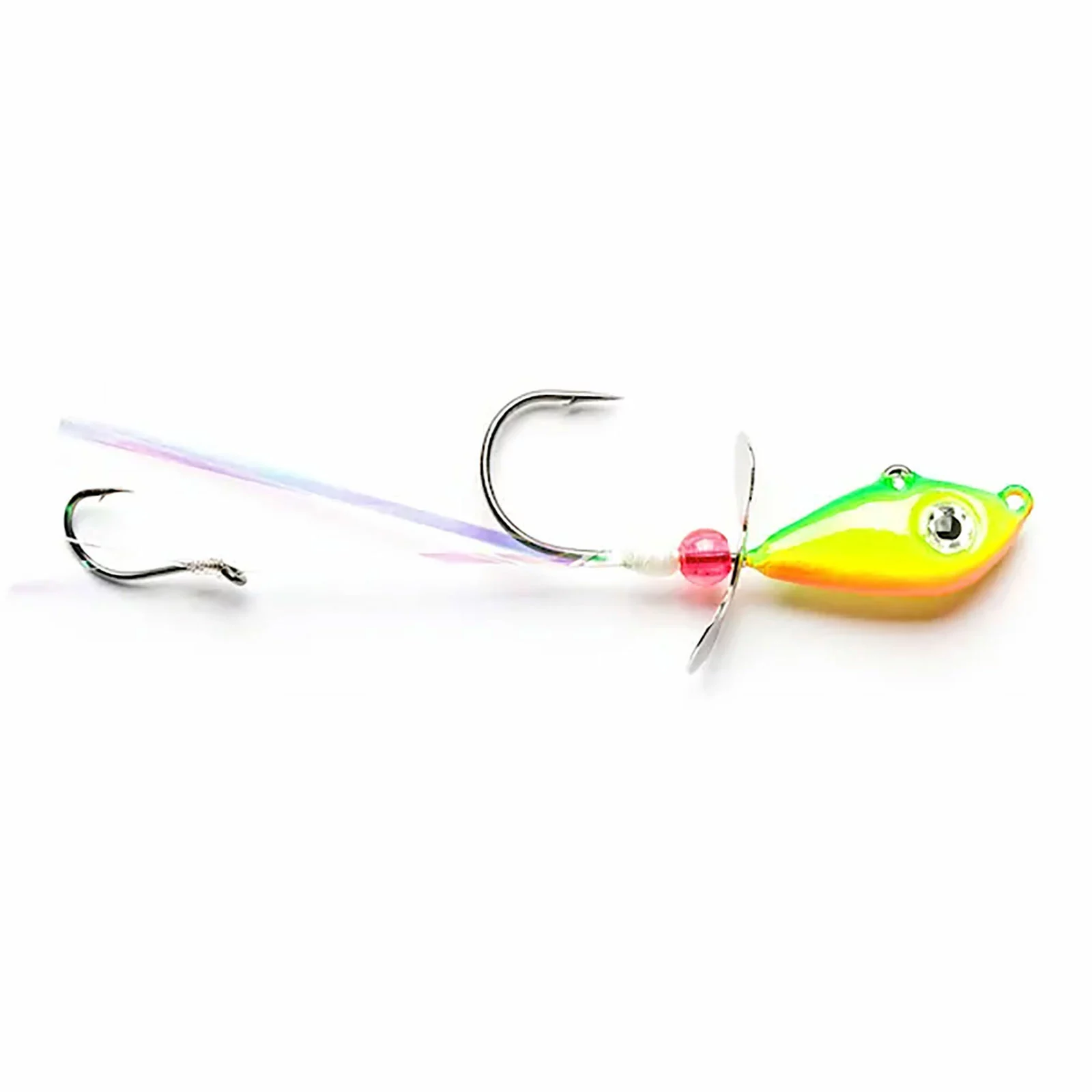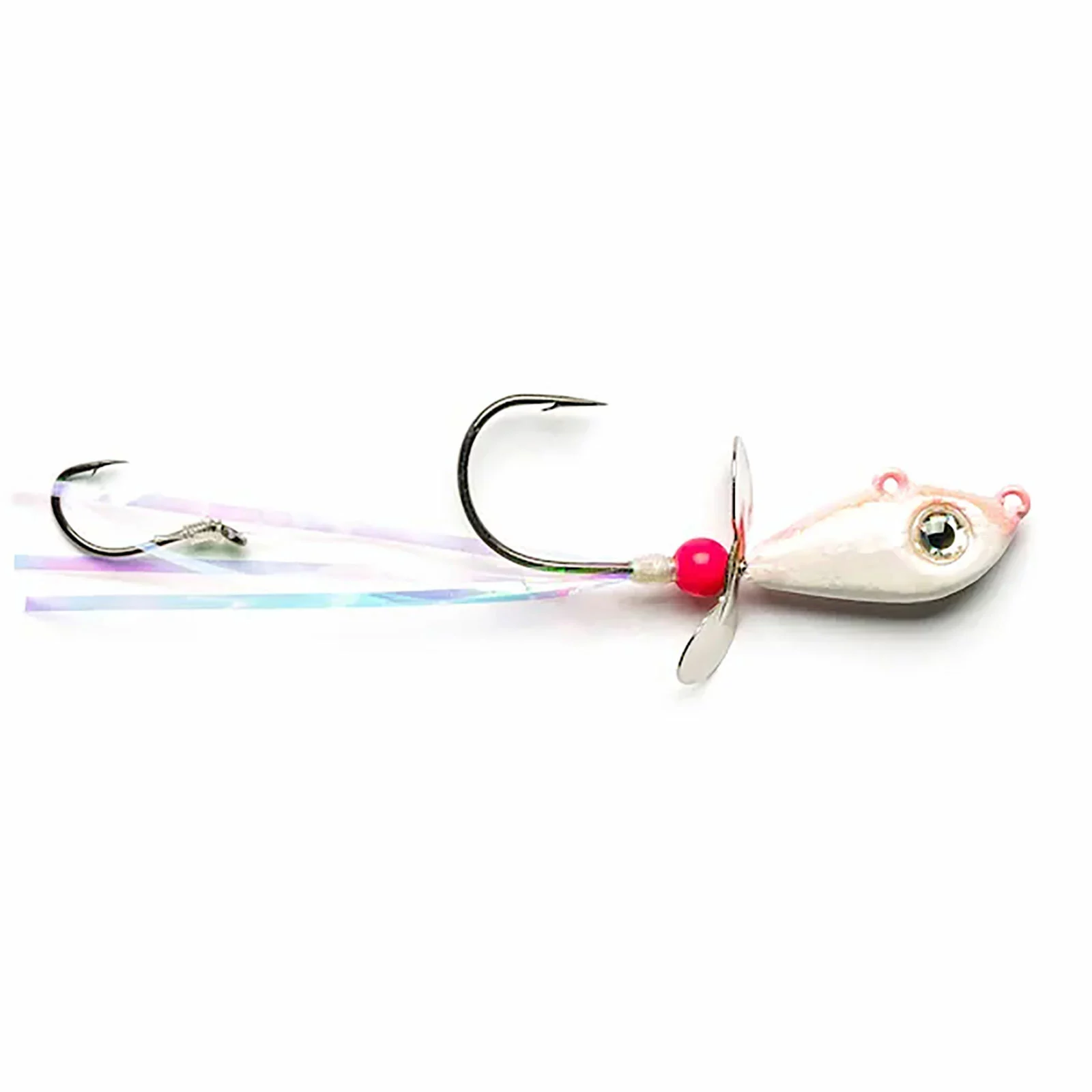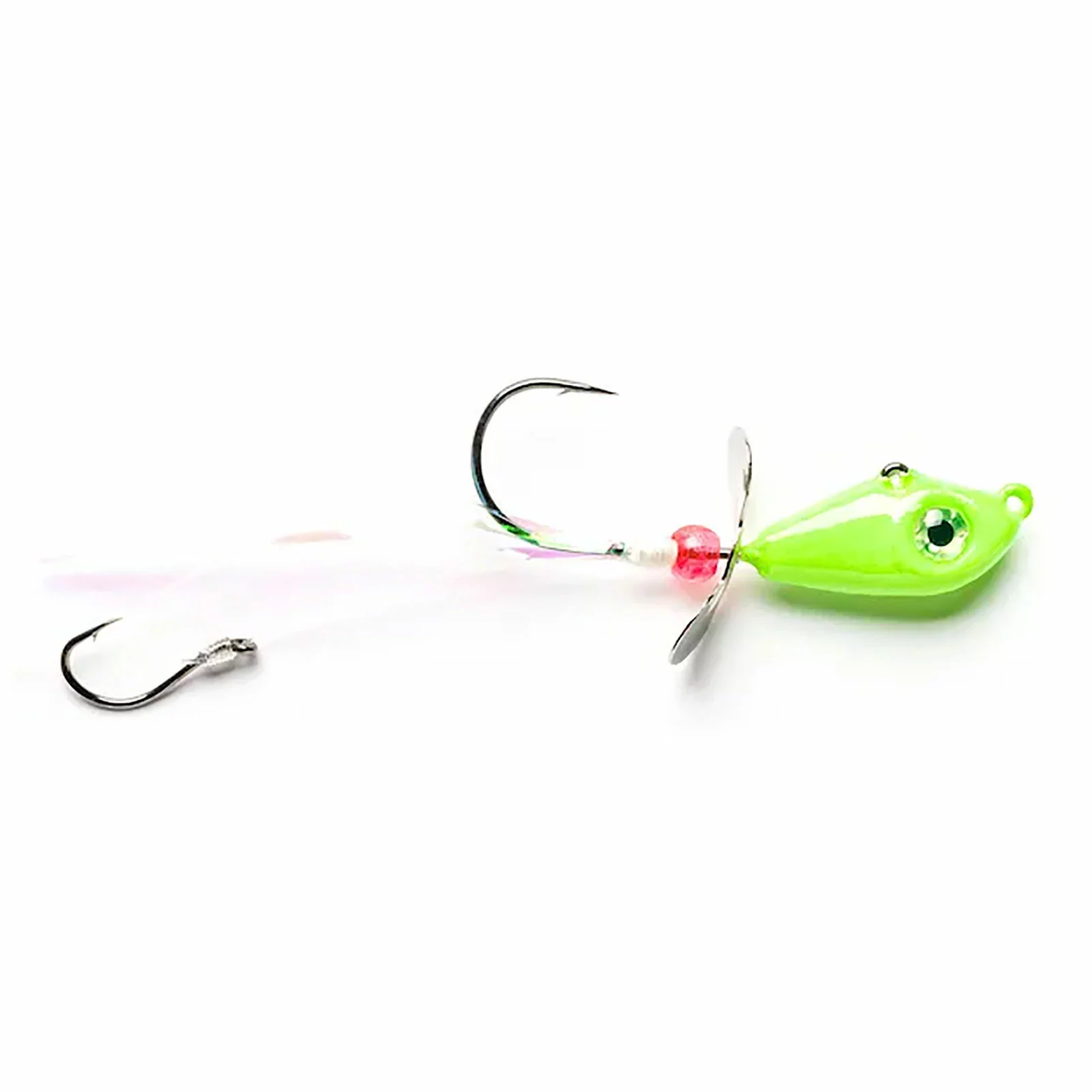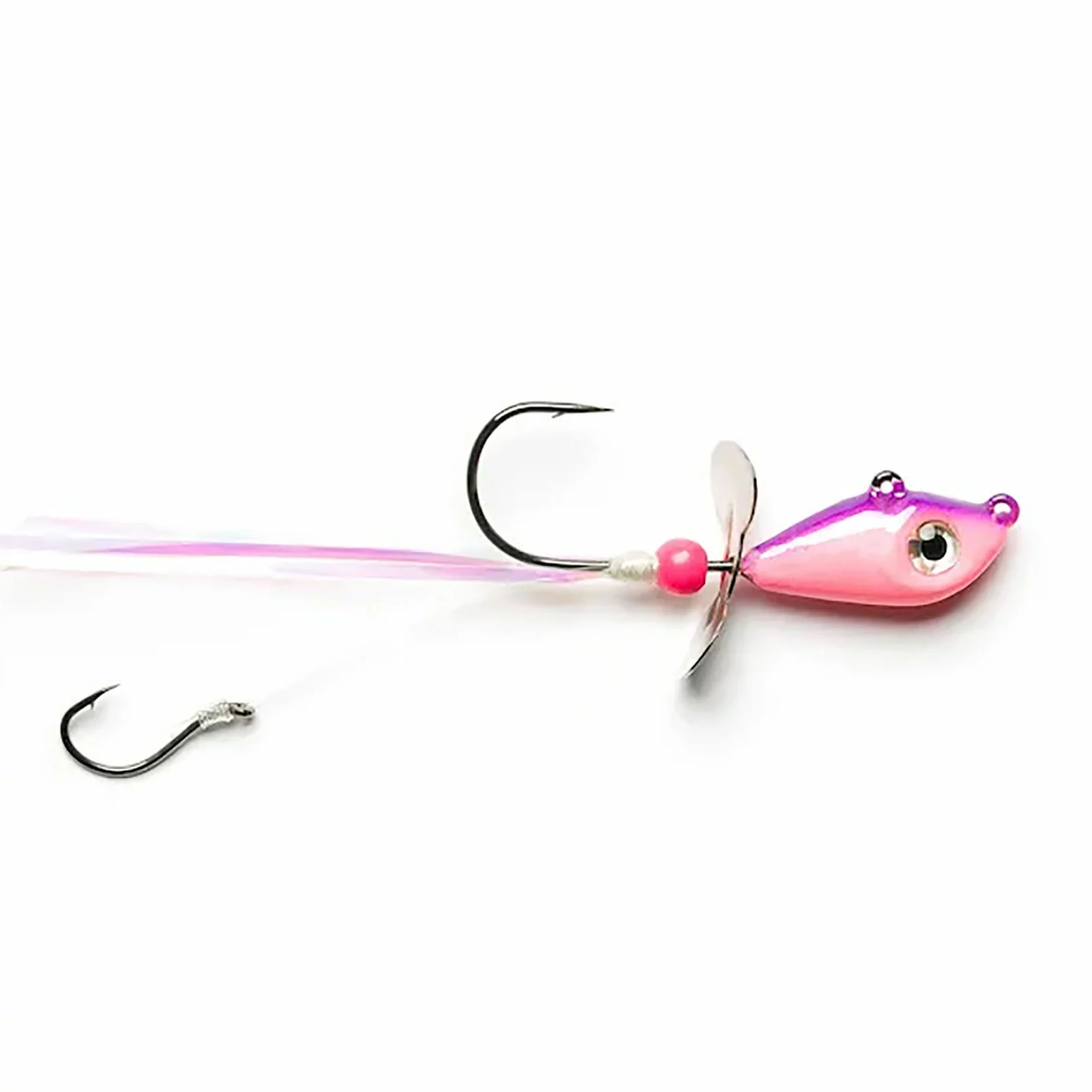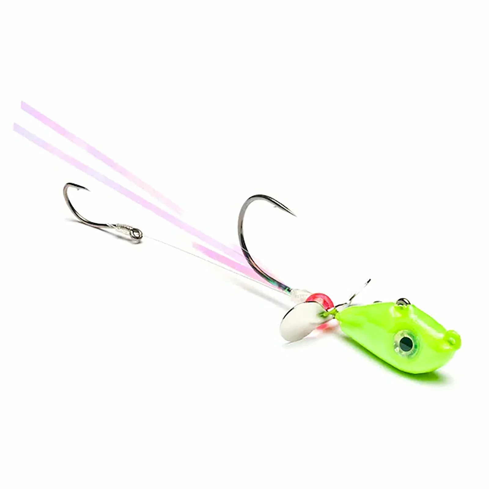 Fishing a Mustad Addicted Walleye Death Spinner Jig using vertical or horizontal presentations creates a flash and bubble trail in the water. The unique Addicted Fishing jig displays a shad-style head and sports a propeller spinner on the shank providing built-in action for the jig on the Mustad 1X fine wire Aberdeen 90º Jig Hook (32746NP-BN).