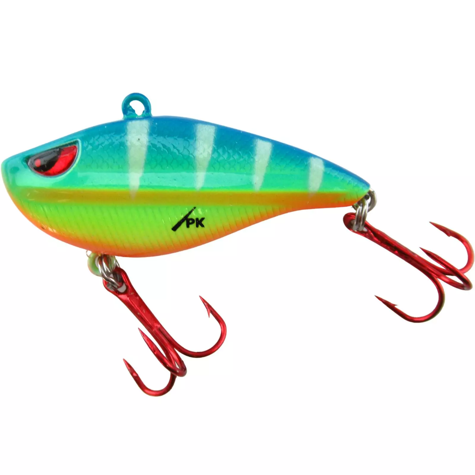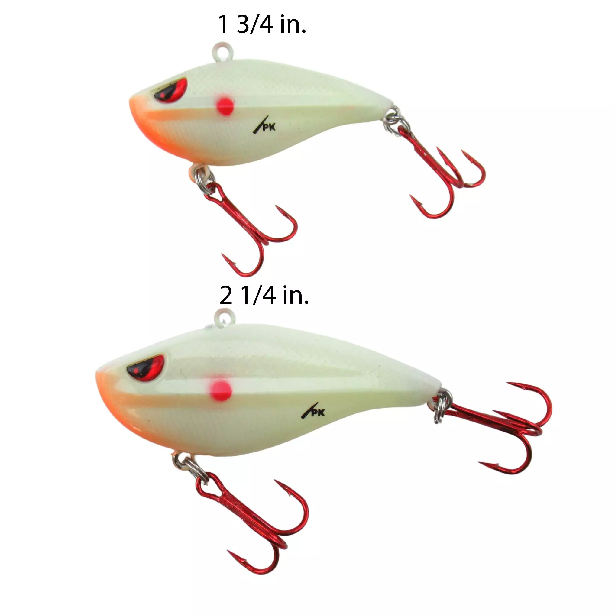 Bring PK Lures Ridge Rattl’r Crankbait with you ice fishing and reap the rewards of the unique design of this jigging and casting lure. This PK Lures rattle bait vibrates intensely on a fast drop, thanks to side ridges that force the Ridge Rattl’r to mimic a wounded baitfish. While you sit on top of the ice jigging, below the ice the Rattl’r swims in unpredictable wide directions and circles back when paused, triggering fish to bite. The PK applies super glow paint to this lure – even the metal color ones! By adding more weight to the front of the lure, this crankbait is heavier than others. This difference allows you to feel where the Rattl’r is at all times and is a key component that enables you to use it in open waters, too. This versatile lure is fish-catching-ready for ice-covered and warmer waters. When used on the open water, the rattle bait’s digging action takes it to the bottom when casting or trolling and mimics baitfish swimming along weed beds and structures. PK Lures suggests a .3 – .5 mph speed while rigging/jigging when trolling. Is this the perfect rattle bait for fishing year-round? The PK Lures Ridge Rattl r Crankbait just might be!