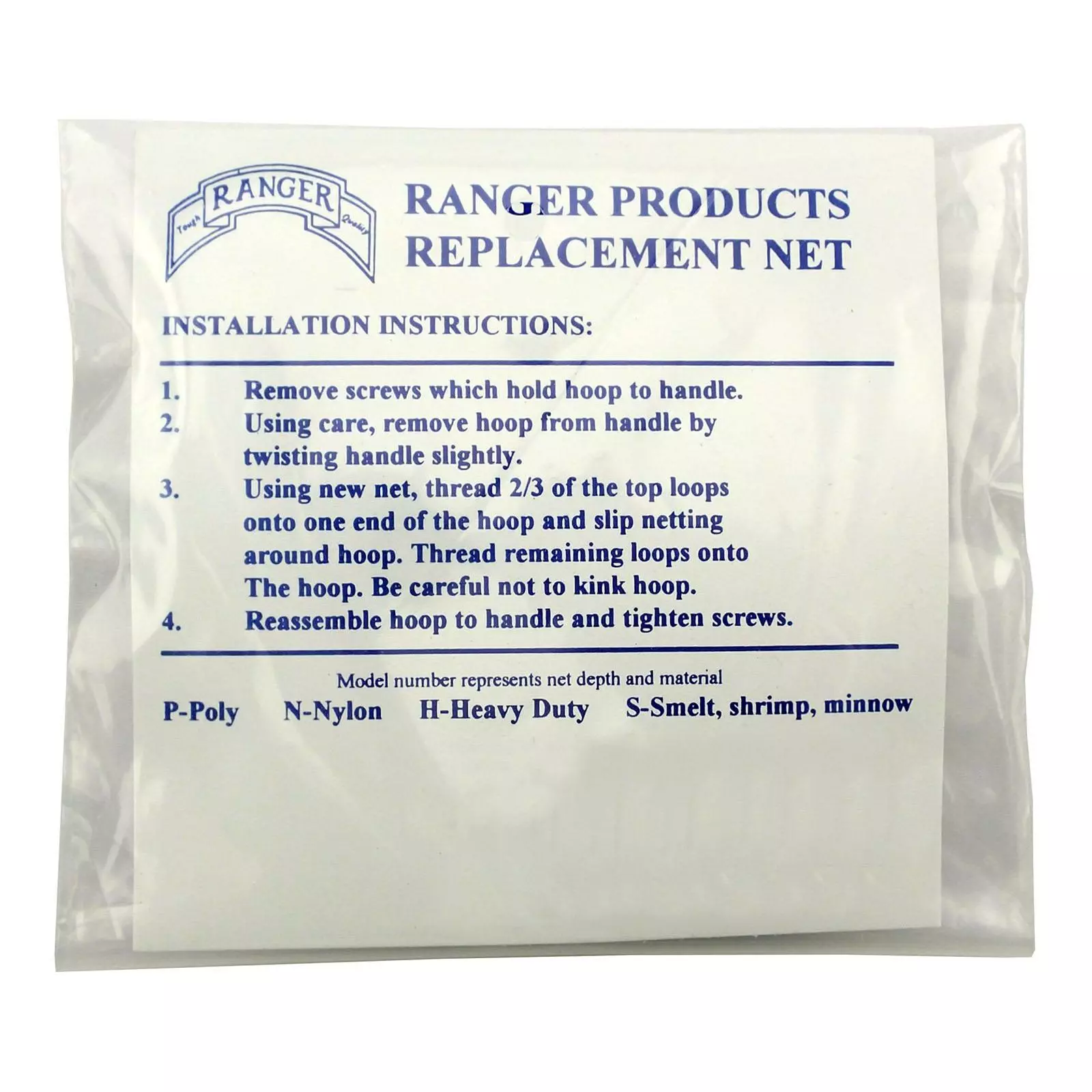 Ranger Standard Replacement Nets are made to fit many different styles and sizes of nets, allowing you to get back to landing fish after a net tear! These replacement nets come in two different styles, poly or nylon, and fit most traditionally sized nets.