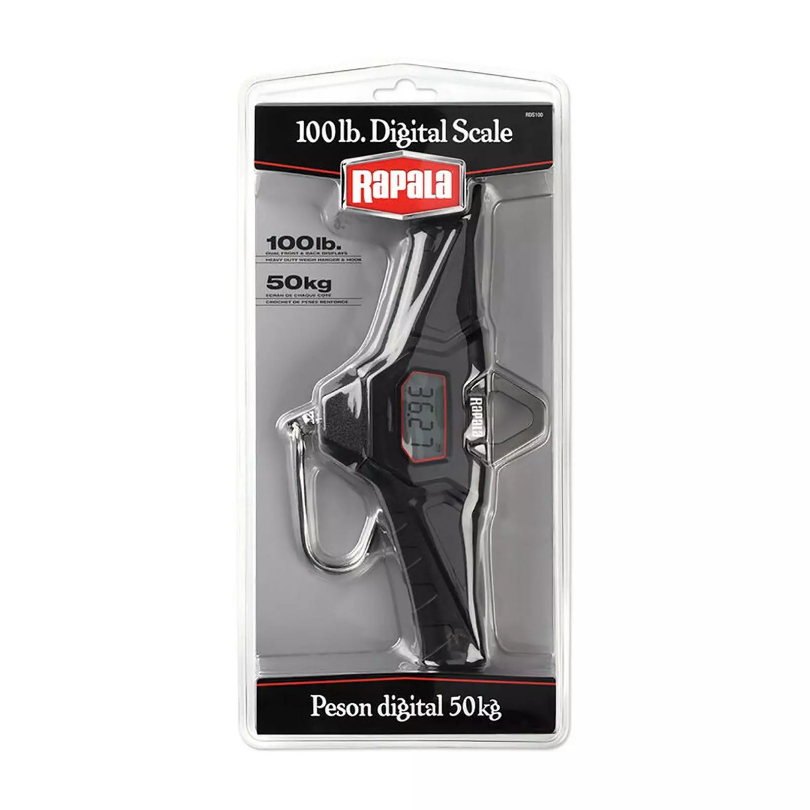 The Rapala 100 lb Digital Scale is an easy tool to measure the big ones with front and back displays. The scale’s ergonomic comfort handles help with the heavy lifting, and the display shows weights in lbs/oz., decimals lbs., or kg. Additionally, the Rapala Digital Scale exhibits the air temperature. The hanger, reinforced and heavy-duty, holds the chrome-plated hook for your catch. Flaunt the weight of your catches in photos or videos with this Rapala 100 lb. Digital Scale!